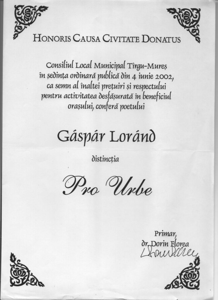 În 26 iunie 2002, la propunerea poetei târgumureşene Marta Iszak, lui Lornad Gaspar i-a fost conferit, titlul de cetăţean de onoare al oraşului Tîrgu Mureş.